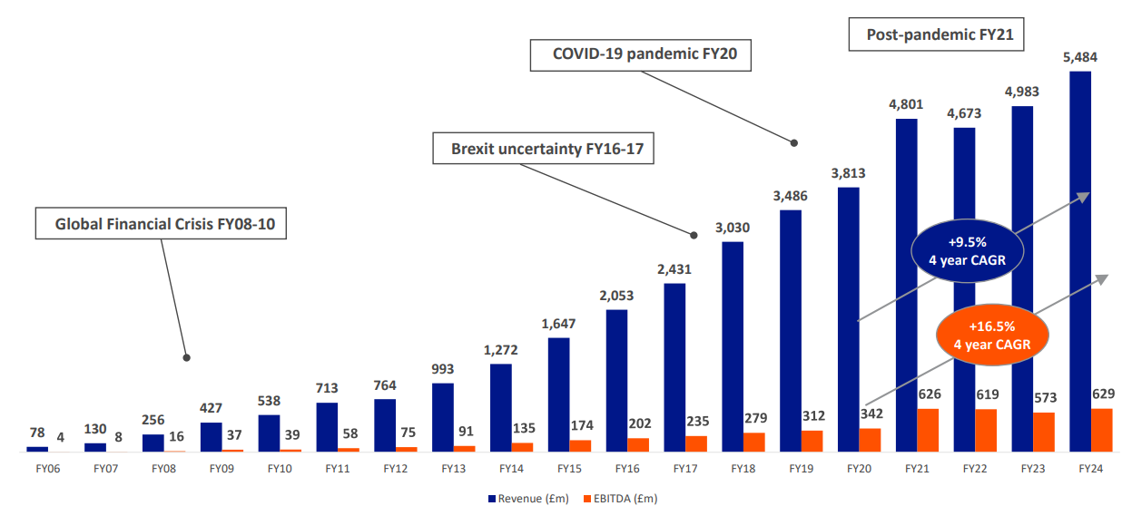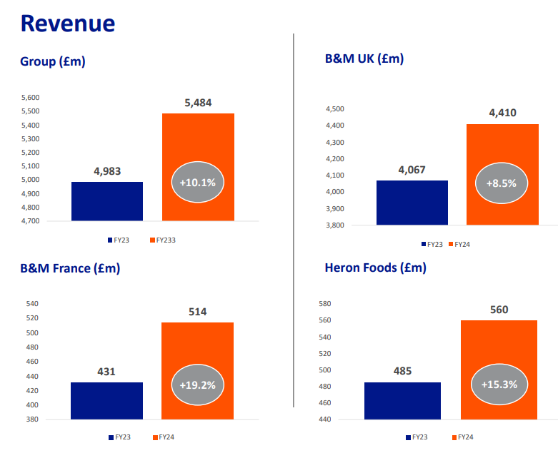 2023/24 results summary: B&M grew quickly during the pandemic but has maintained positive revenue growth since then, albeit profit growth has been less consistent as various cost headwinds have hit the business: