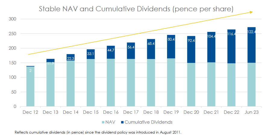 "Dividends maintained at 3p per quarter, 9.5% yield, based on share price, as at 30 June 2023"
