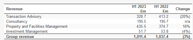 The UK delivered the biggest hit to revenue. The firm's home market generates about 40% of group revenue, but management said UK commercial property transactions fell by 60% during the first half of the year and were 46% below the five-year average.
