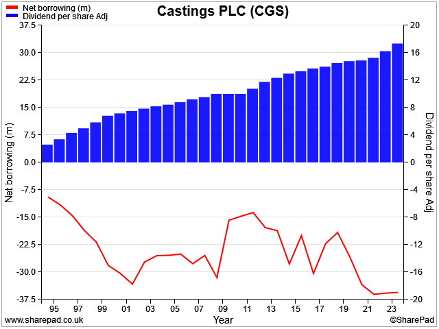 I think this is an excellent and well-run business. As far as I can see, Castings has maintained a net cash balance for at least 30 years and has never cut its dividend.