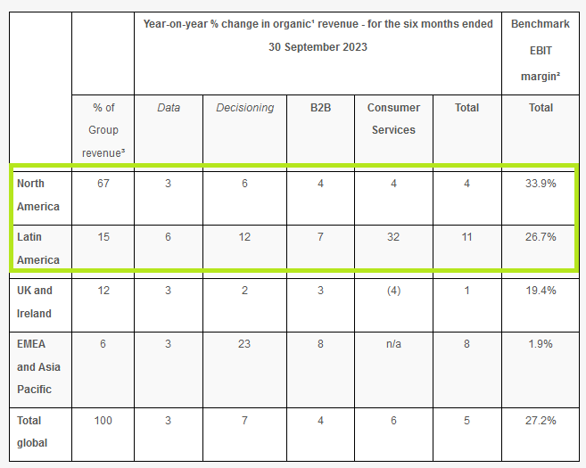 Europe appears to be subscale and something of a weak spot for Experian. As the chart below shows, North America and Latin America account for the vast majority of both growth and profit (due to higher margins):