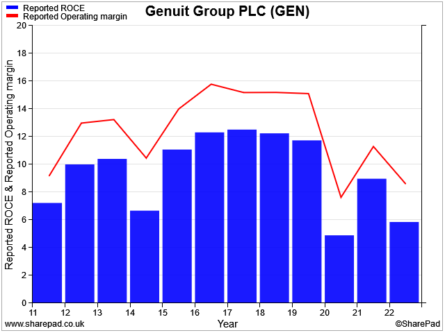 Genuit has achieved operating margins of 15% in the past, but not since the pandemic. Returns on capital employed have also fallen from c.12% to 6% over this period.