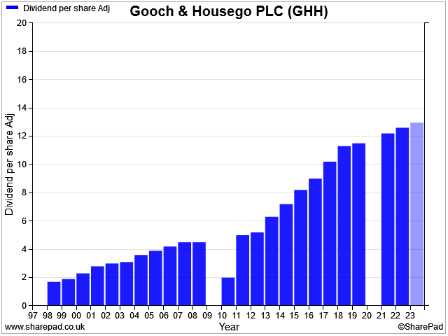 The interim dividend rose by 0.1p to 4.8p per share. That puts the group on track for a payout of 13p this year, resuming a 25-year growth trend:
