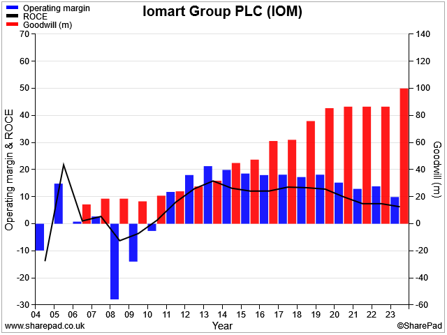 While operating margins still look reasonable to me, return on capital employed has fallen more sharply as acquisitions have piled goodwill onto the balance sheet:
