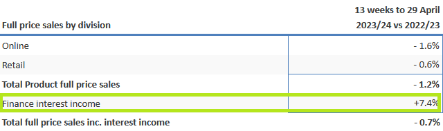 - Full price sales for the 13 weeks to 29 April were down 0.7% versus last year, compared to guidance of -2%
