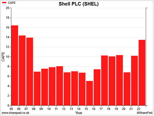 One metric I like to use in this scenario is the CAPE ratio (price/10-year avg earnings). SharePad data tells us that Shell still looks quite expensive on this metric, relative to historic levels: