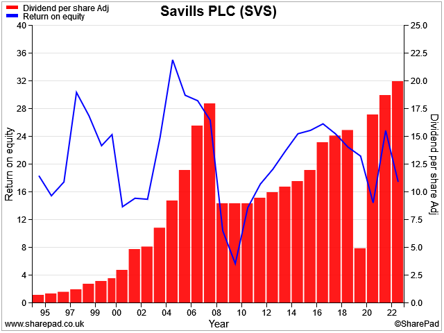 Savills has generated an average return on equity of c.20% over the last 30 years, according to SharePad. During that time, its dividend has grown steadily, if we exclude the boom years of 2005-2007.