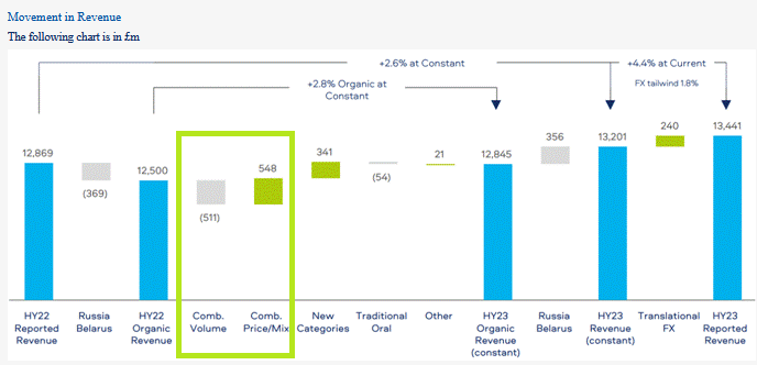 This graphic from the H1 numbers provides a neat illustration of how price increases are used to offset volume declines: