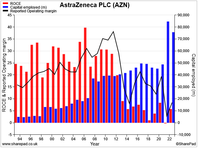 Profitability: AstraZeneca's balance sheet capital employed has risen from $41bn to $75bn since 2012. I think this mostly reflects spending on acquisitions and new products, which has lifted intangible assets from $26bn to $58bn over the same period.
