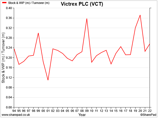 My sums sugest Victrex's inventories now represent 34% of trailing 12-month revenue. According to SharePad data, this level has only been seen twice before, in 2008/9 and during the market crash at the start of the pandemic: