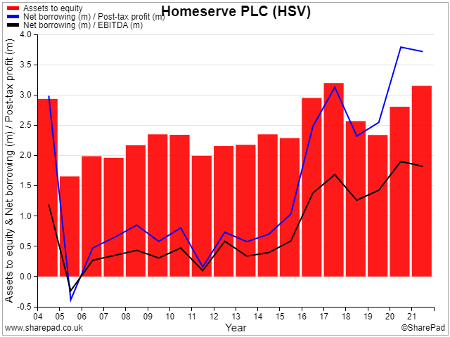 In Homeserve's case, I think it makes sense to look at debt in a more conventional way too, so here's a chart that tells a more complete story.