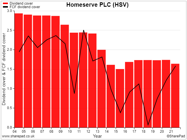 Interestingly, this chart highlights why I only check for dividend cover by earnings in my screen, not free cash flow. Homeserve has an excellent record of free cash flow in my view, but free cash flow is often lumpy for growing businesses, as they invest in expansion. I think that's what we can see here.
