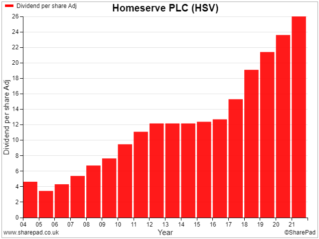 Homeserve has paid a dividend every year since at least 1995, giving it a 27-year streak. According to SharePad, the payout was cut modestly in 2005 after the group was spun out of South Staffs Water. Otherwise, there haven't been any reductions. It's an impressive record.