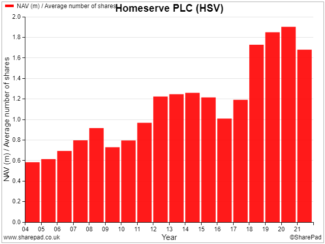 Even so, I think it's a useful check. Homeserve's net asset value per share has in fact risen strongly over the years. Just not in a straight line: