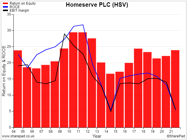 Using the more conventional net debt/EBITDA ratio (black line), Homeserve reported leverage of 2.1x at the half-year mark. I prefer to see this metric limited to 2.0x, but for profitable, cash-generative businesses I can accept a little more.