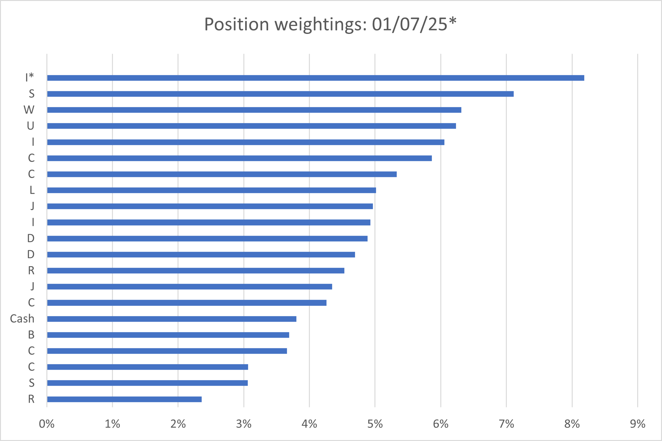 After top-slicing 'I' on 7 July, the portfolio's cash weighting has risen to over 6%.