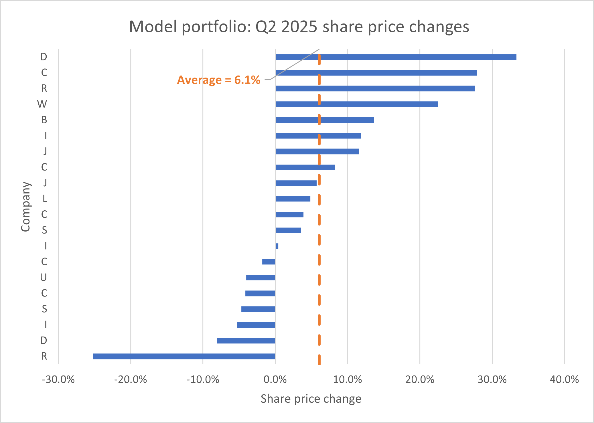 Shares within my portfolio delivered the usual broad range of price movements during the second quarter. Happily there was a strong positive bias in Q2, providing a pleasant contrast to Q1: