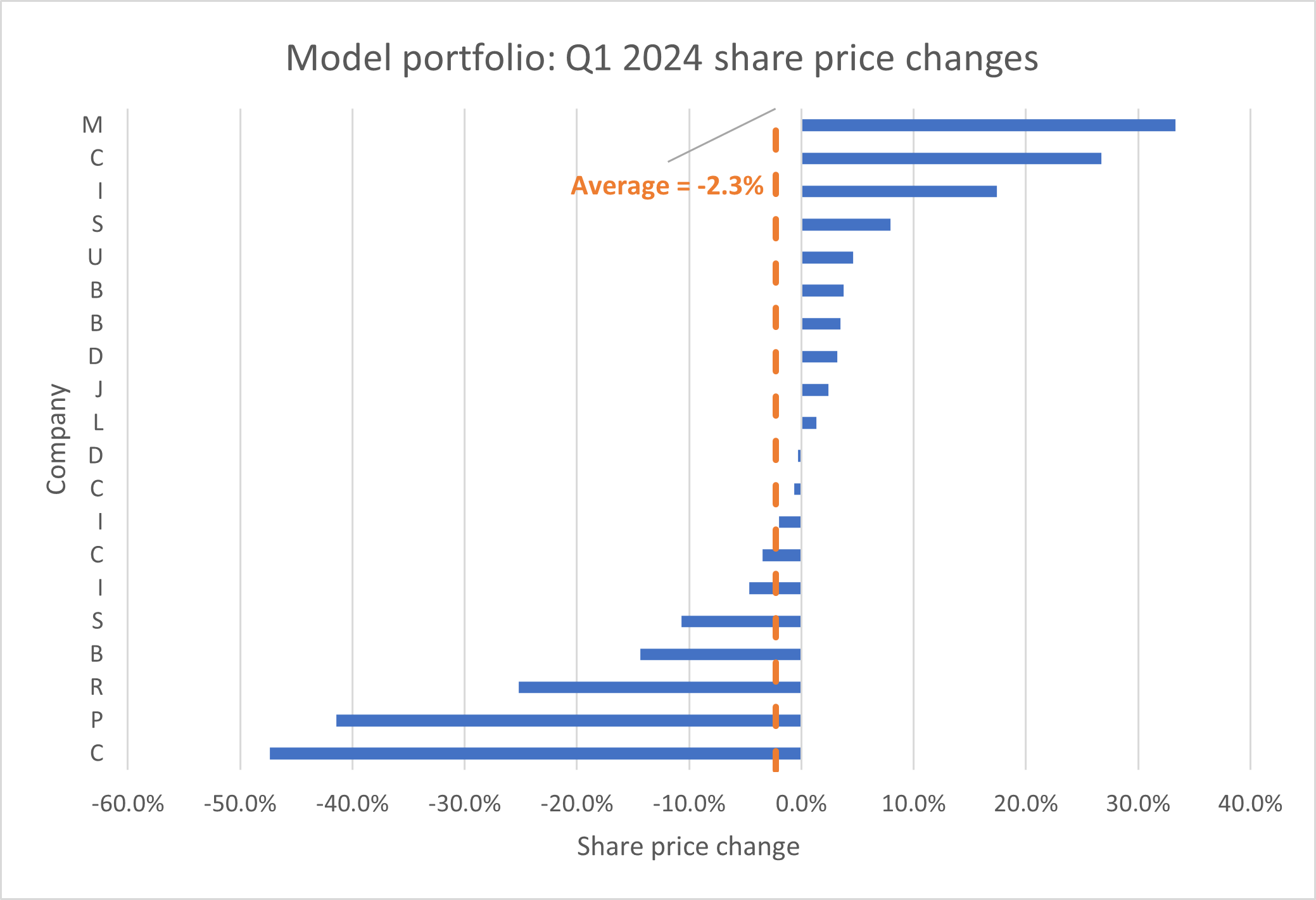 The portfolio's slight loss in Q1 was largely the result of sharp falls suffered by two of the portfolio's FTSE 250 companies. These cancelled out more positive performances elsewhere, leading to an average share price fall of 2.3%: