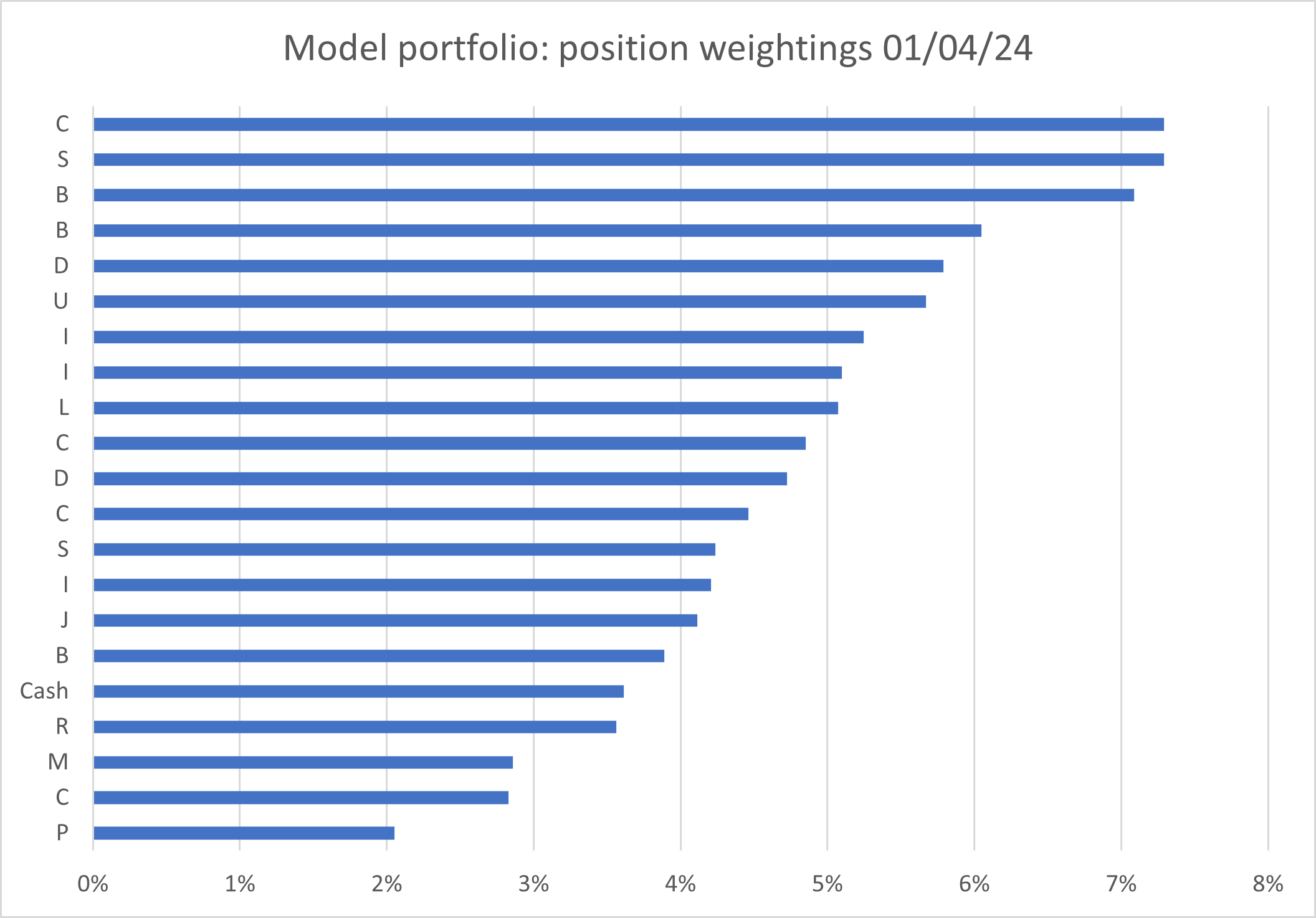 Here's how the model portfolio looked at the end of the first quarter of 2024, following last year's share price movements and the transactions listed above. Subscribers can see this chart with ticker codes included on my portfolio page: