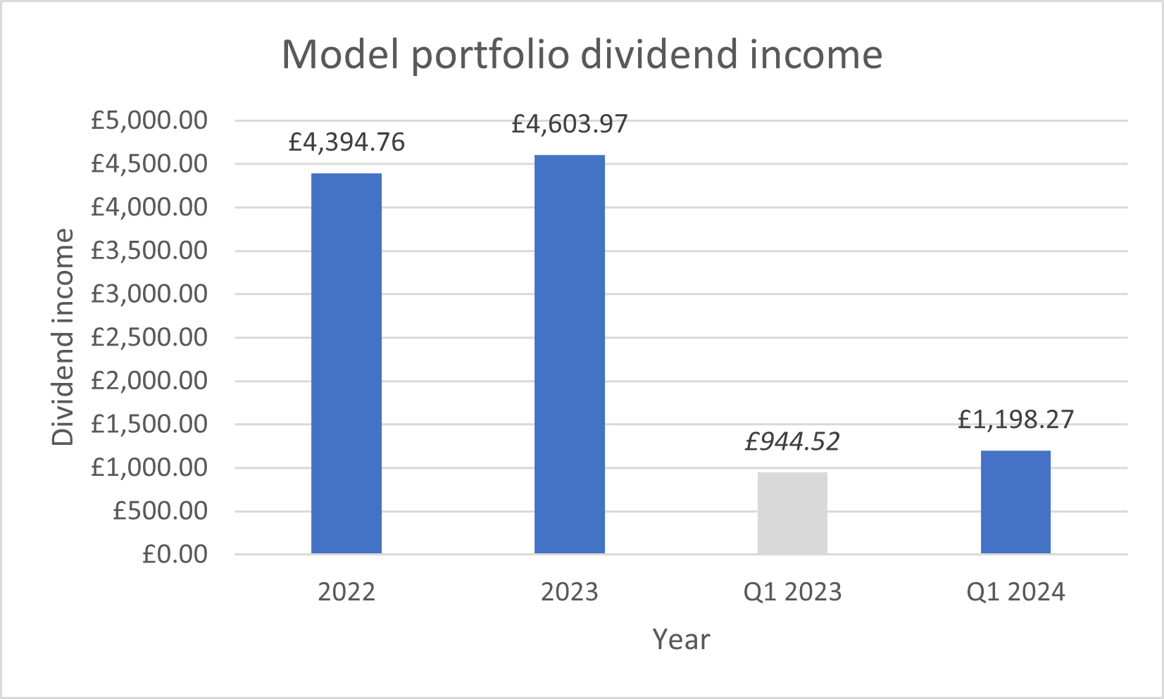 Dividend payouts received in the model portfolio during the first quarter totalled almost £1,200, a 26% increase on the same period last year: