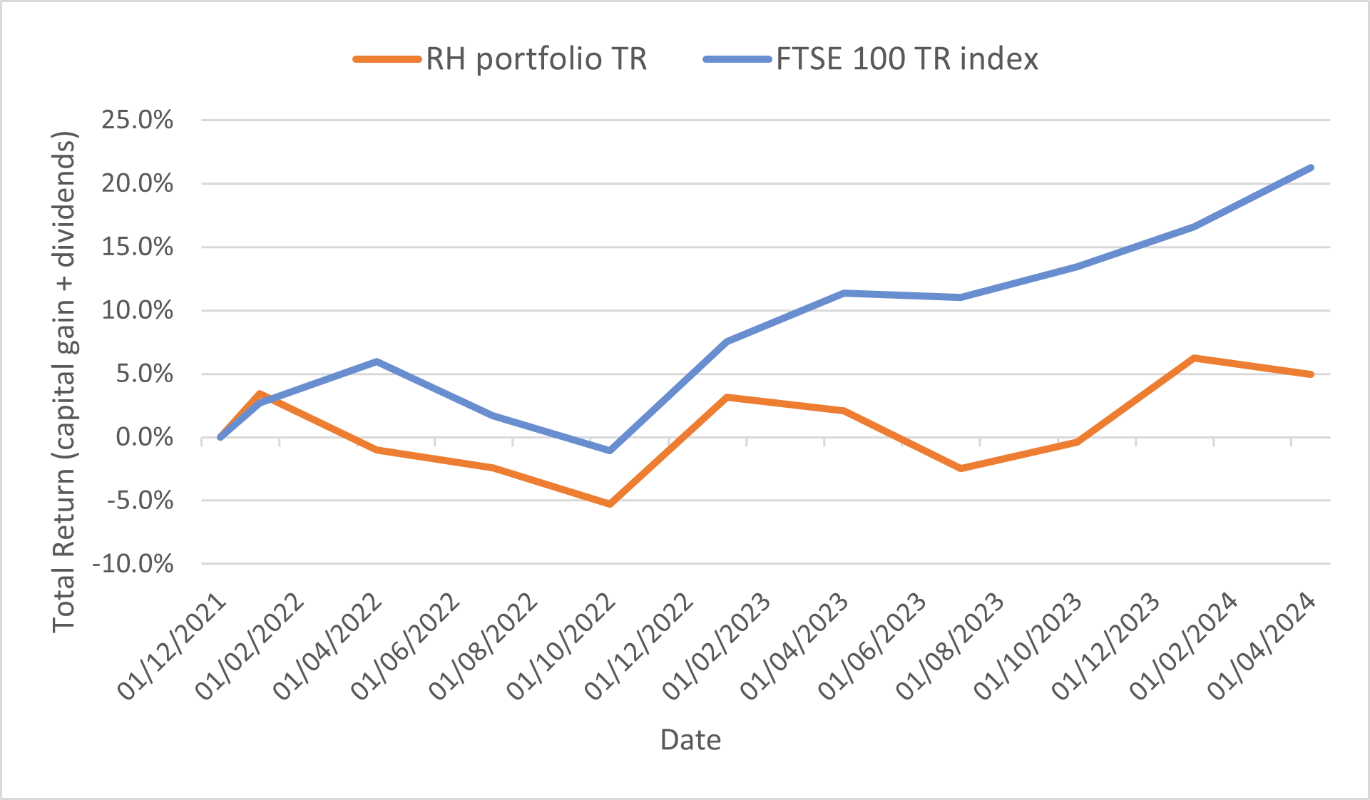 This chart shows the performance of the portfolio against the FTSE 100 Total Return index since the model portfolio's inception on 1 December 2021: