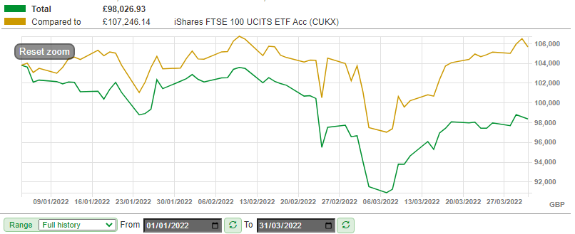 To put this in context, the iShares Core FTSE 100 ETF Acc (CUKX) I use as a benchmark delivered a total return of +3.4% over the period.