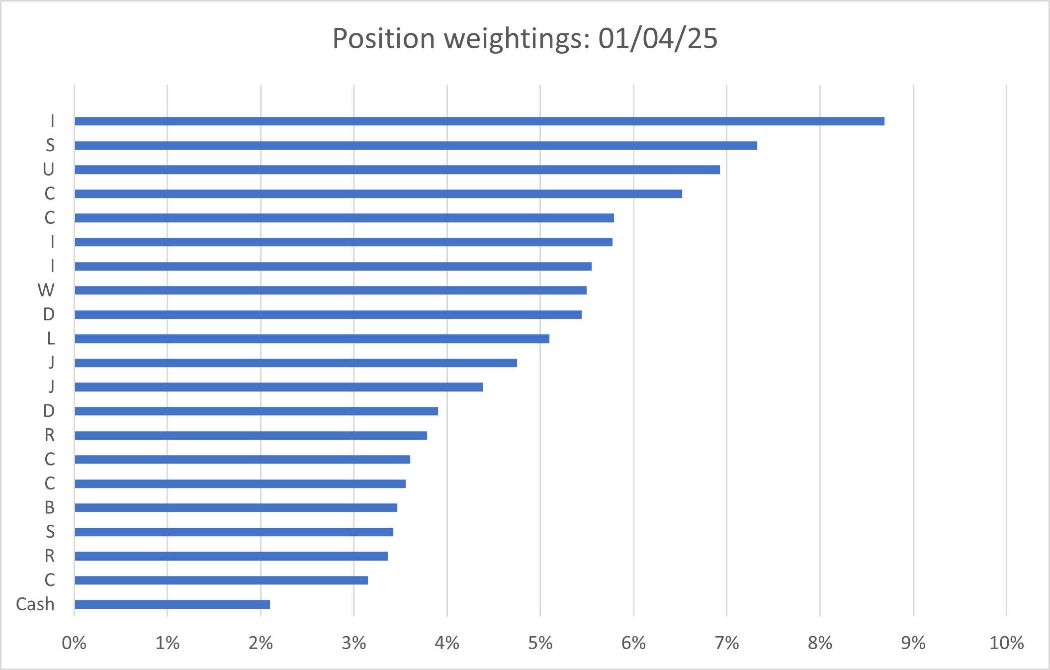 My model portfolio positions are all initiated with a weighting equivalent to about 4.7% of the original portfolio capital. Occasionally I make top ups, as discussed above.