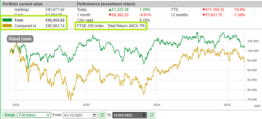 As I discussed at in my 2024 review, the model portfolio has beaten the FTSE 250 Total Return index since inception – this remained true in Q1: