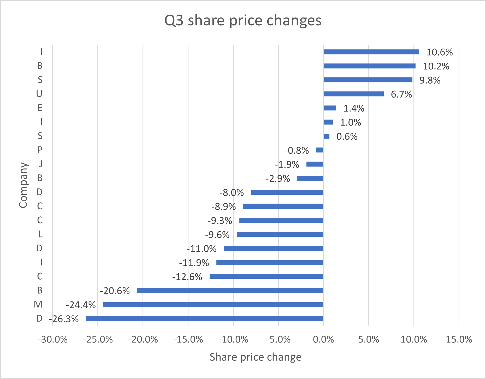 The majority of fallers in the portfolio during Q3 were those with exposure to a cyclical downturn, especially in consumer sectors.