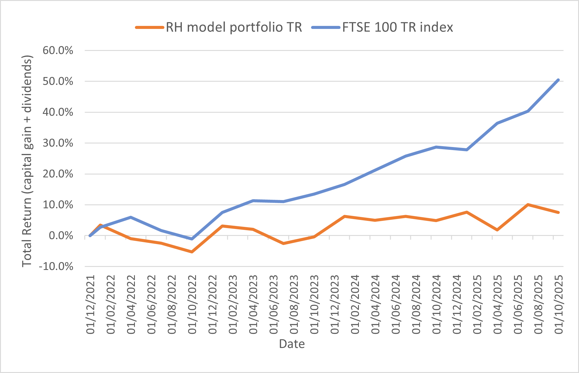 The chart below gives a broader view on the model portfolio's performance since its inception in December 2021. Sadly, the Q2 improvement in performance against the benchmark was not maintained in Q3: