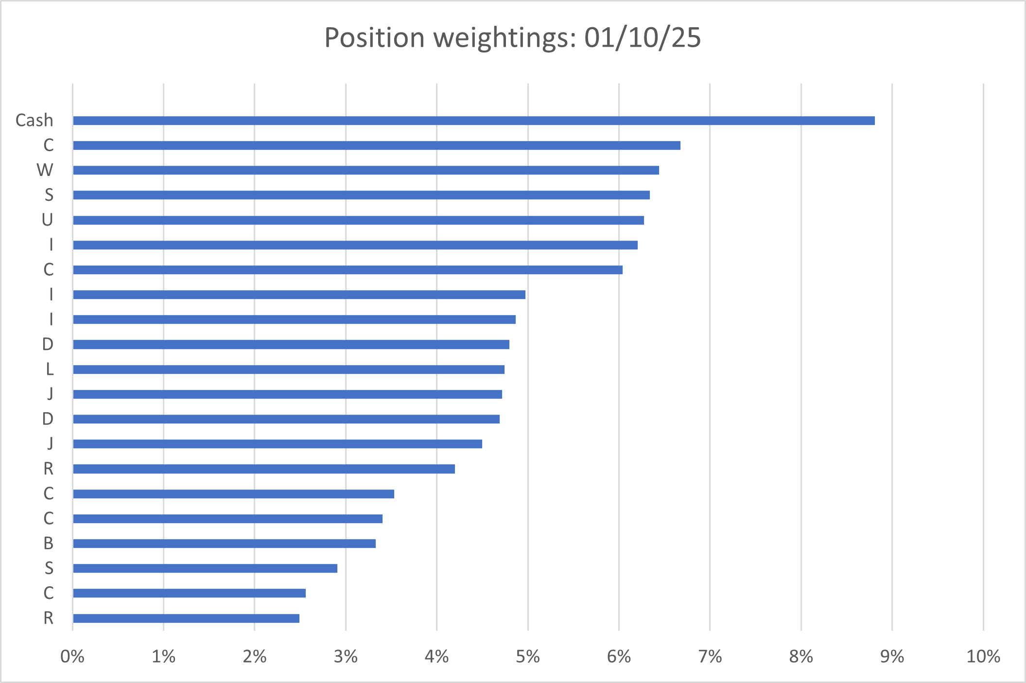 As mentioned above, I sold the <3% position 'S' (Somero Enterprises) earlier in October. This means the portfolio now has 19 stocks – and a 12% cash weighting.