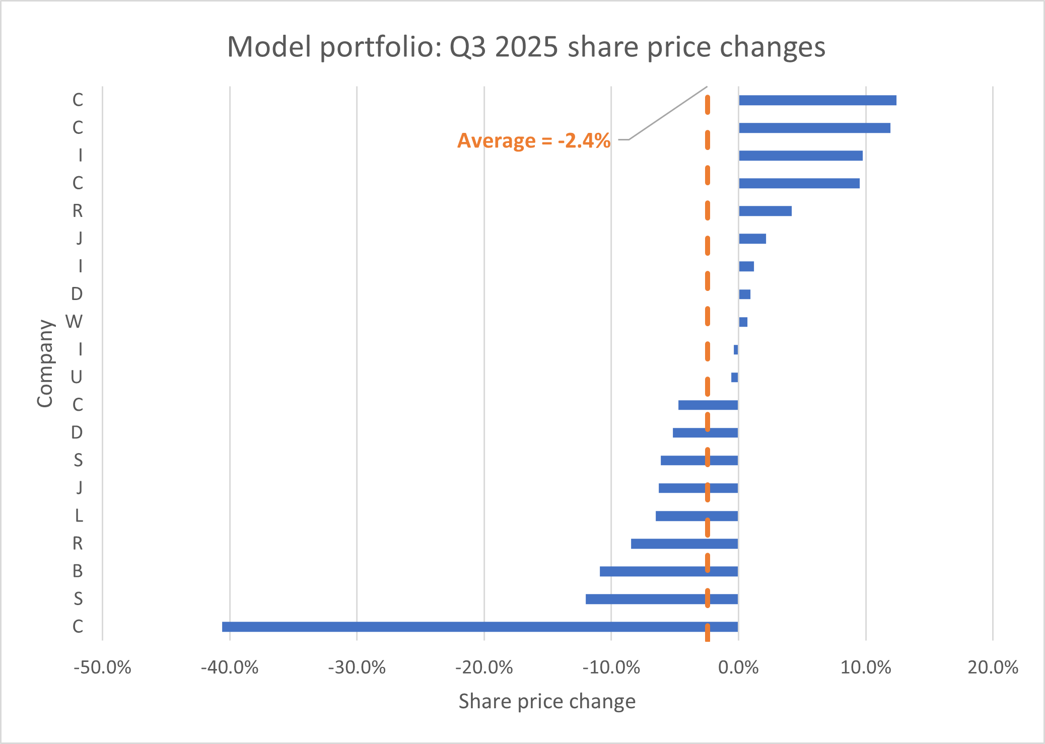 Looking within the portfolio suggests that Q3 underperformance was primarily due to the absence of big risers during the period, relative to the FTSE 100: