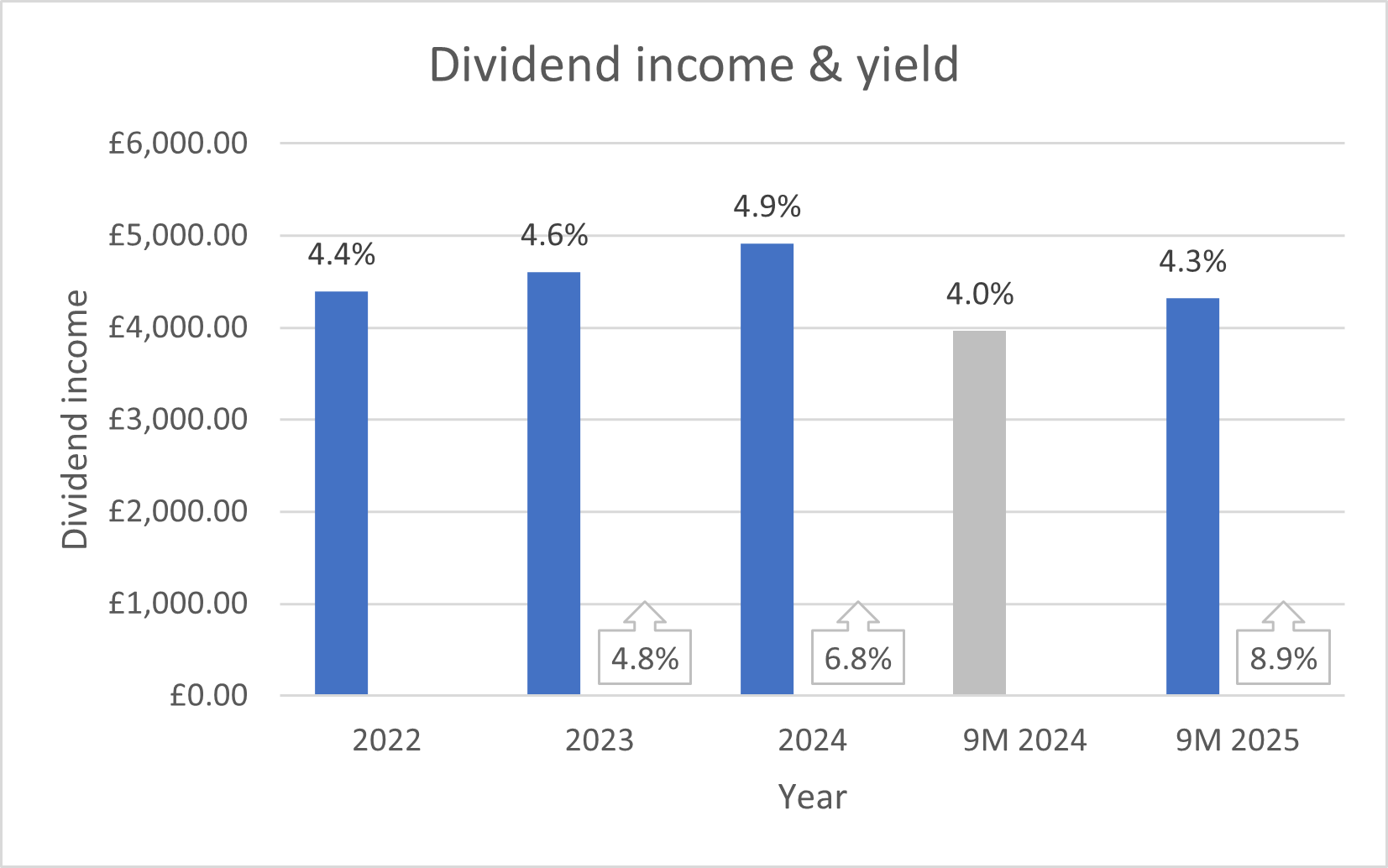 Scroll L-R (Data source: SharePad/author analysis. Some adjustments were needed. *Dividend yields were weighted to reflect position size from 2025 onwards. Prior to this they were simply averaged.)