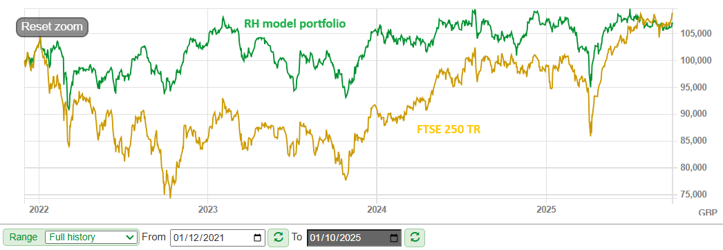 The portfolio's longstanding lead over the FTSE 250 Total Return index is also now at risk: