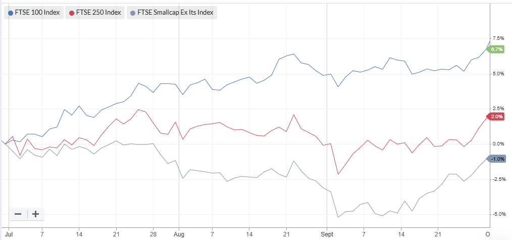 - FTSE 100: nine stocks rose by 20% or more in Q3, with 32 rising by 10% or more