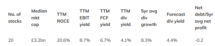 | Median mkt cap | TTM ROCE | TTM EBIT yield | TTM FCF yield | Net debt/5yr avg net profit | TTM div yield | 5yr avg div grth | F'cast div yield | No. yrs div paid |
