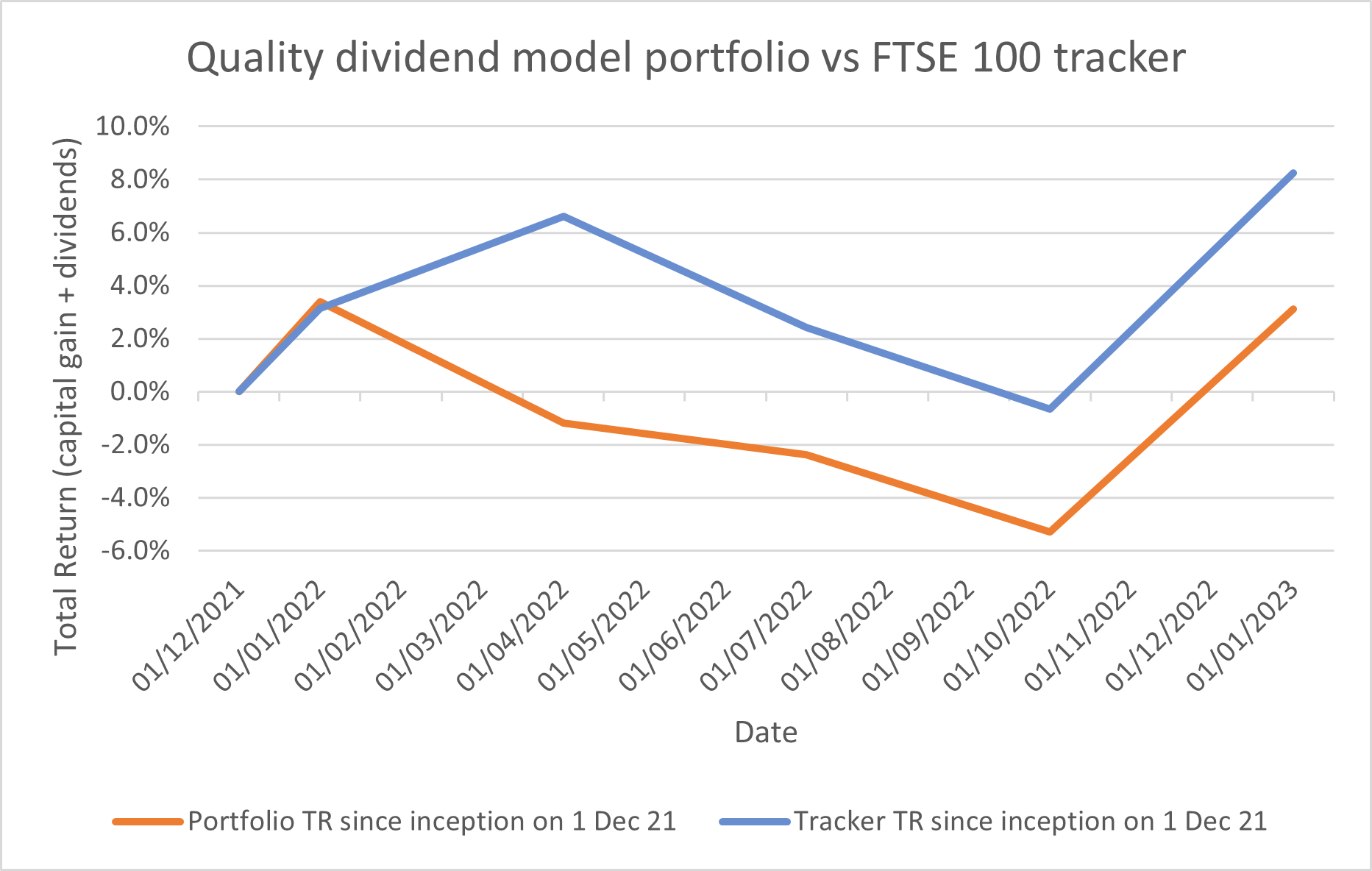 This chart shows the portfolio's performance against its FTSE 100 tracker benchmark since inception (01/Dec/2021). Both lines show total return (capital return + dividends):